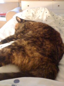 This morning she jumped onto the bed and realized I wasn’t going anywhere. and so she made like a hearthrug and stretched, comically flat onto my lap, purring like a Ferrari in neutral.