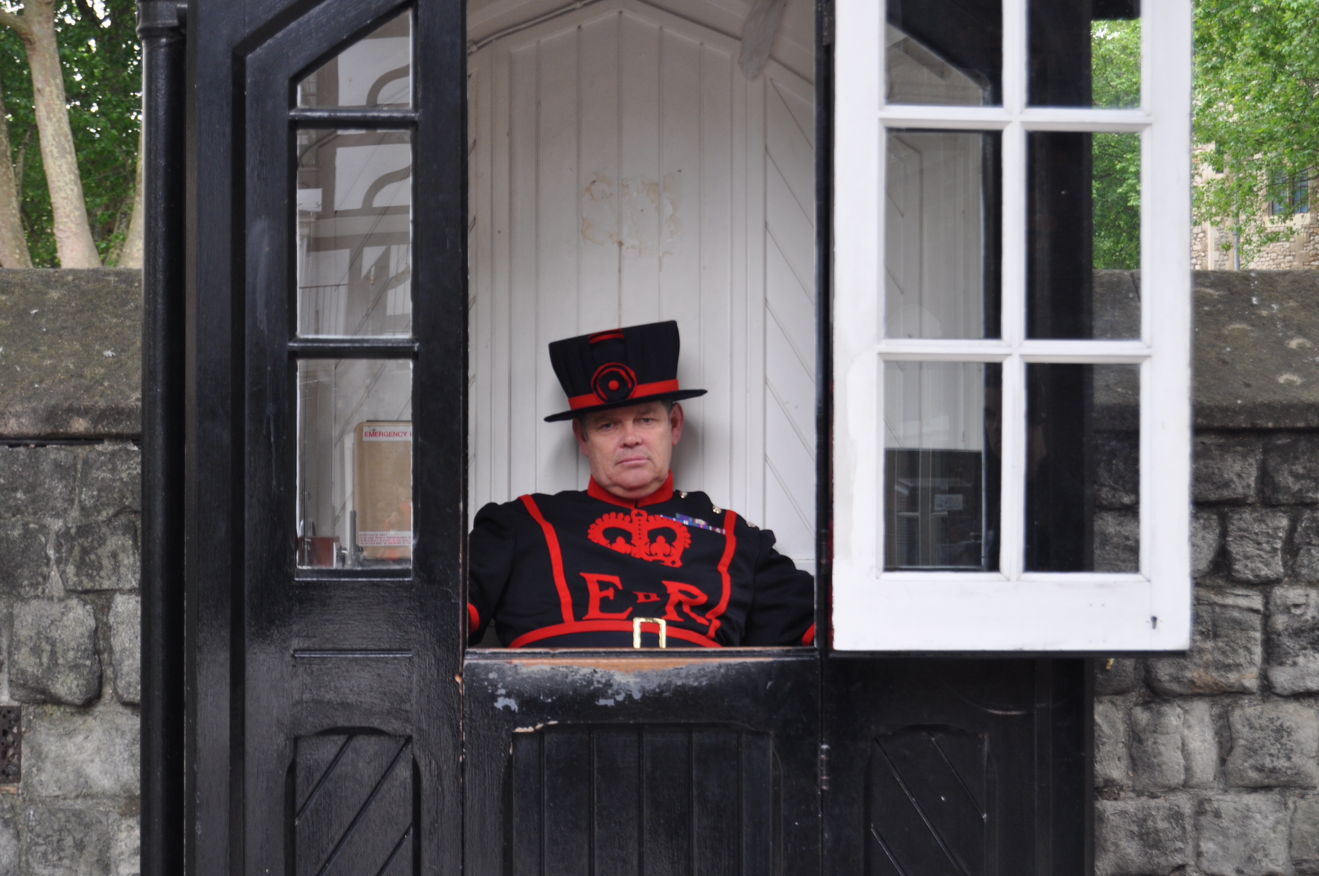 These are scattered through the Tower’s grounds. They are jolly smart: and they sit Beefeaters in them. Why, I am not quite sure. It looks to be some sort of steward role. Anyhow, sitting inside the shed was a Beefeater, stewarding or suchlike.