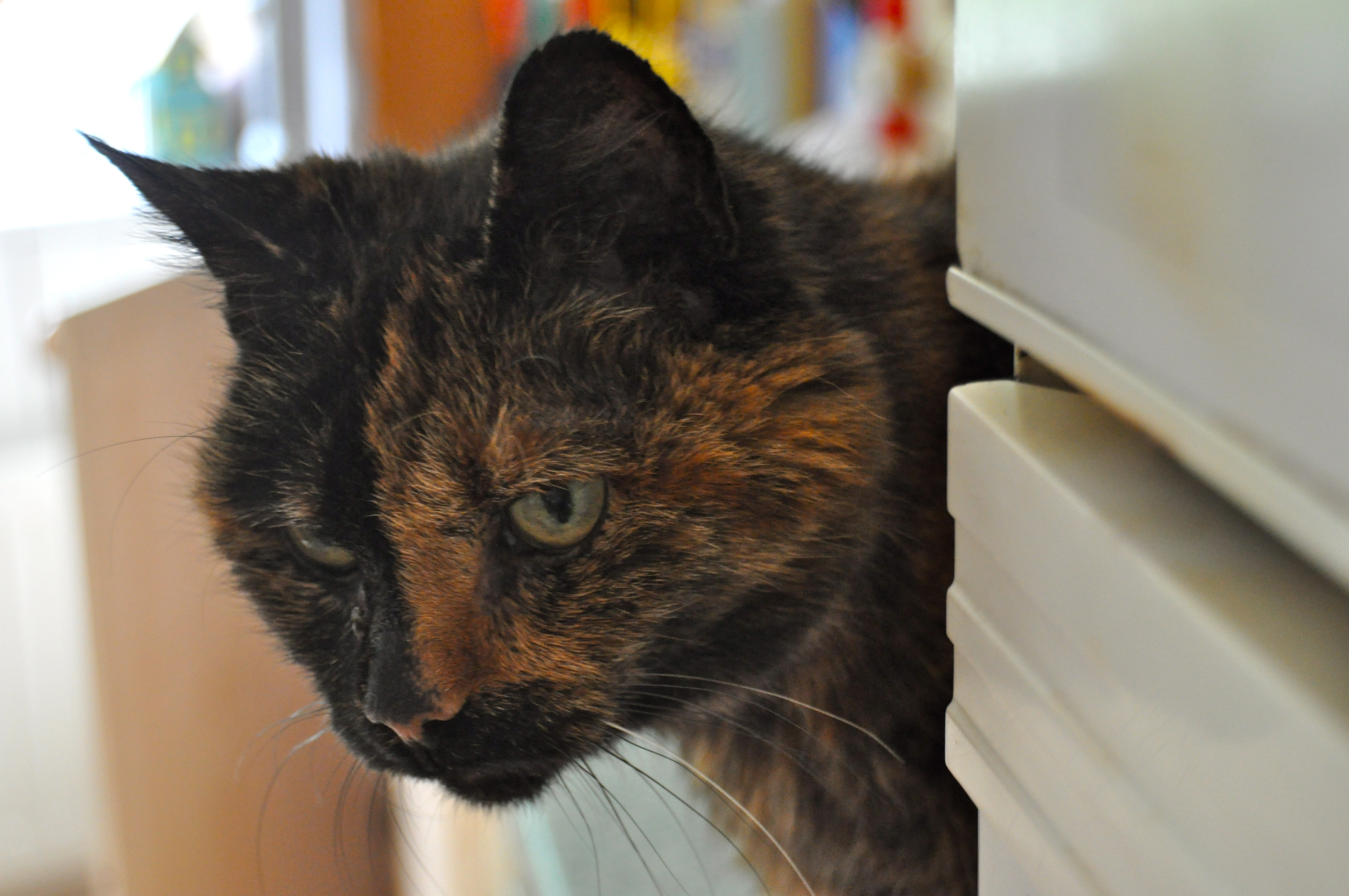 I followed his gaze. Across the kitchen, on her own personal kitty shelf far from the barking crowd, sat the queen of terror, she of the satanic eyes, HRH Kit Kat Shrewsday. A few moments before she had been looking old and grey and full of sleep, as Yeats would say; she is, after all, 18 years old and a tortoiseshell dowager of the first order.