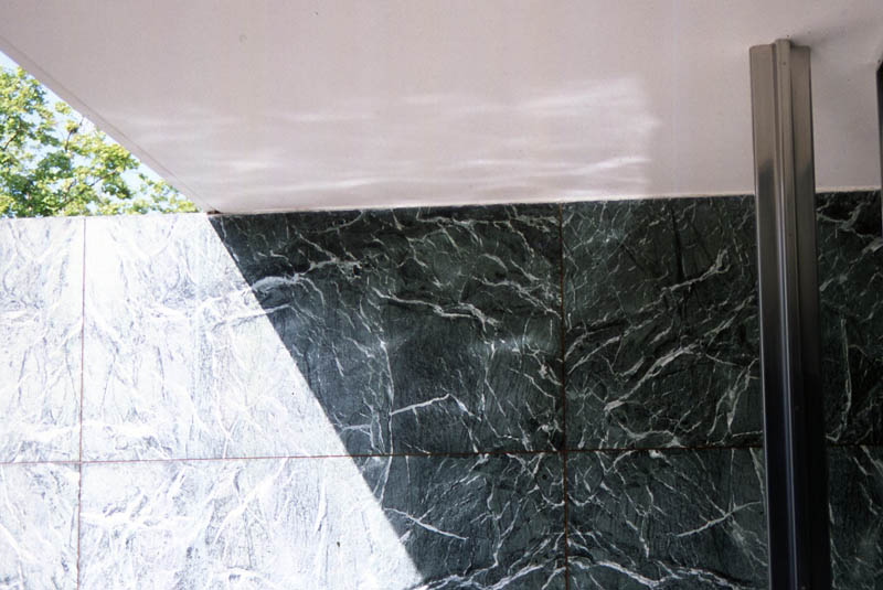 1. My understanding is that when Mies got the commission to design the building for the German government, one stipulation was that the German flag be represented; he did not take this requirement literally.