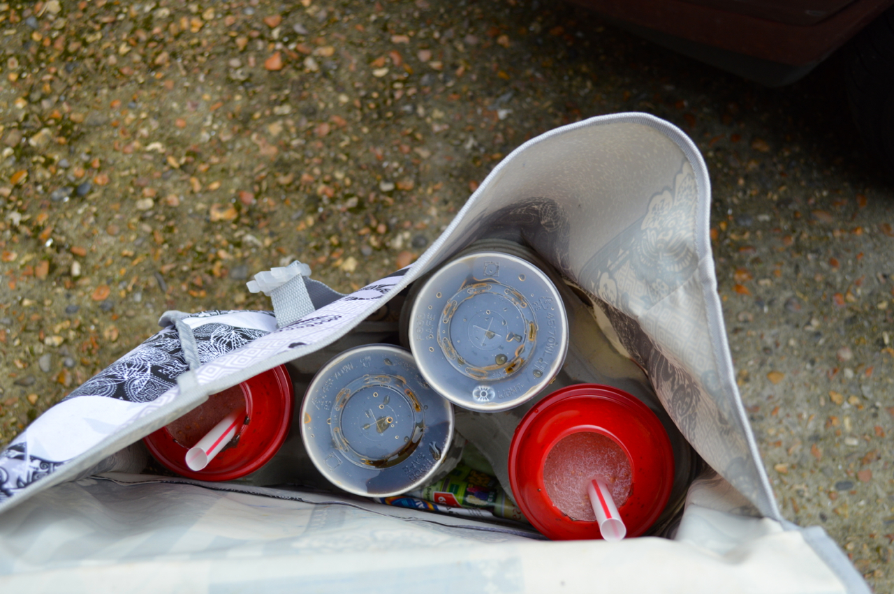 I have two large panniers on the back of my bike. Large, baggy, undisciplined panniers. One held the boneless banquets and burgers splendidly; and then we set to work to bolster two cokes, ice included, and two chocolate milk shakes.