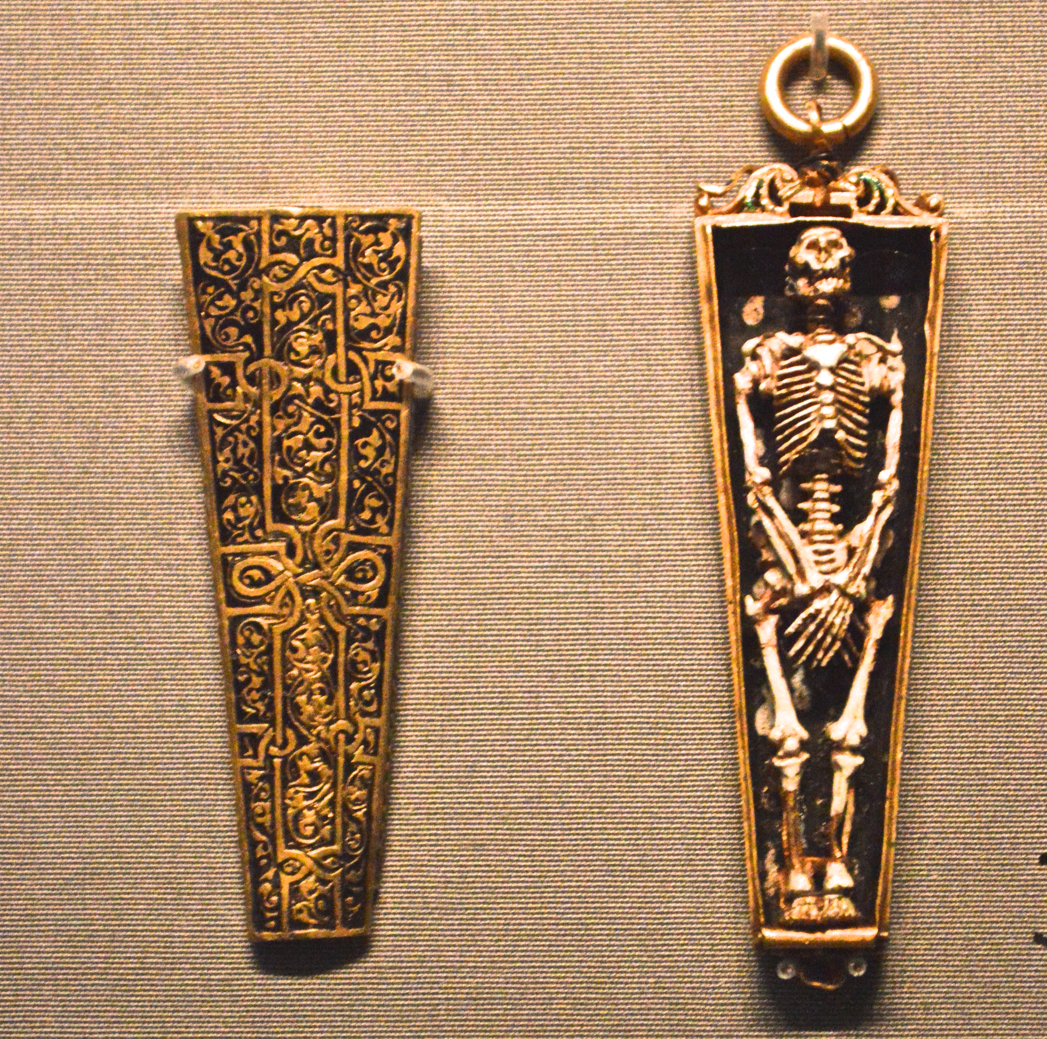 No: I am a Memento Mori kind of gal. In the 1500s it was common to wear reminders that we all die. They were Him – Mediaeval Death. Grinning Demise, encapsulated in theatre. Elsewhere in the V&A there is a tiny skeleton in a coffin. Someone found it in Torre Abbey in Devon, but it was ten years to young to have belonged to a monk. Once again, its provenance is shrouded.